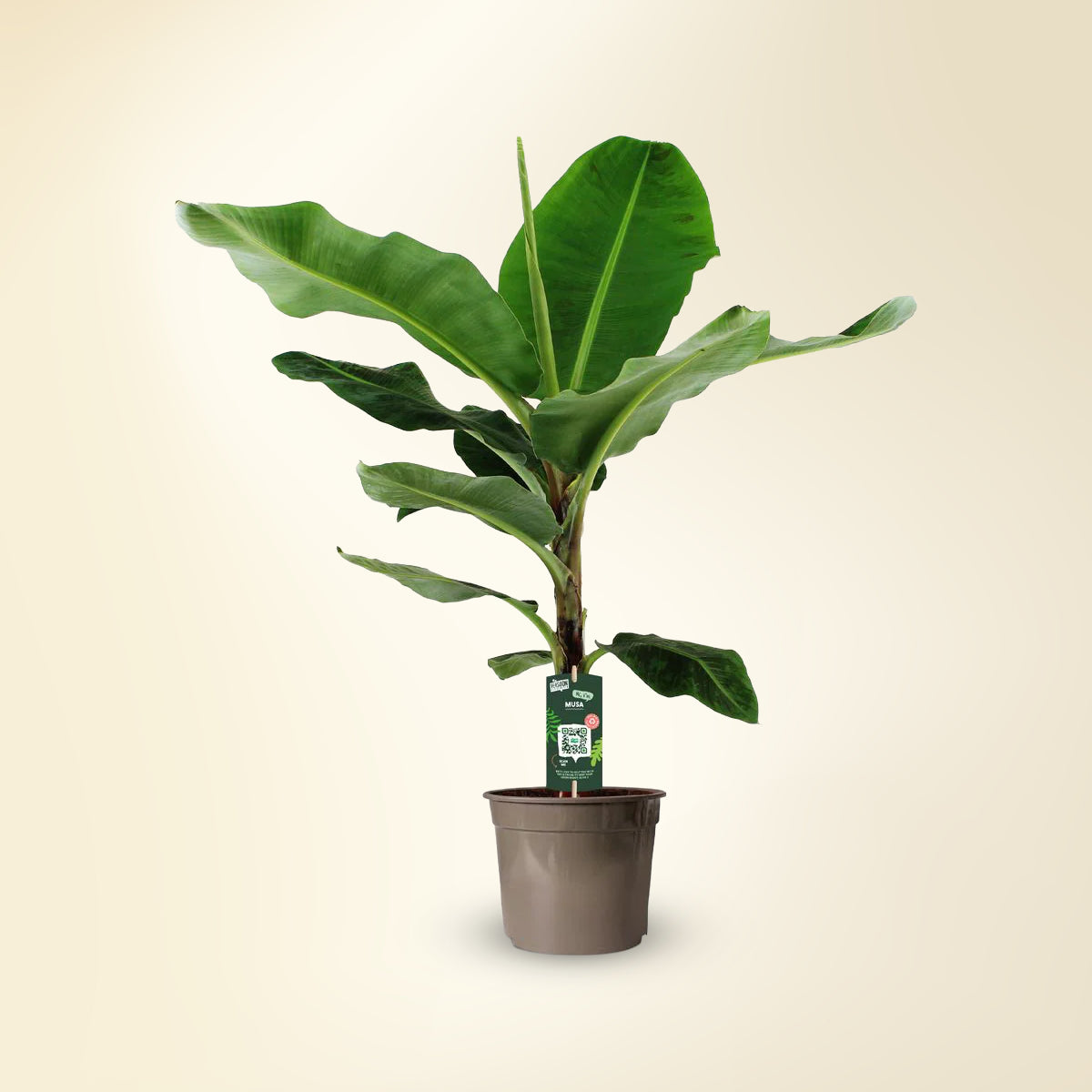 De bananenplant (Musa) is een stoere, tropische kamerplant, direct herkenbaar aan haar enorme, frisgroene bladeren die een echte junglesfeer naar binnen brengen. In groot formaat zorgt ze voor een indrukwekkende aanwezigheid, ideaal voor woonkamers, keukens of lichte hallen. Ze houdt van constant licht vochtige grond, hoge luchtvochtigheid en veel helder maar indirect licht. Diervriendelijk en exotisch, de bananenplant is een uitstekende keuze voor iedereen die zijn interieur een tropische uitstraling wil geven.